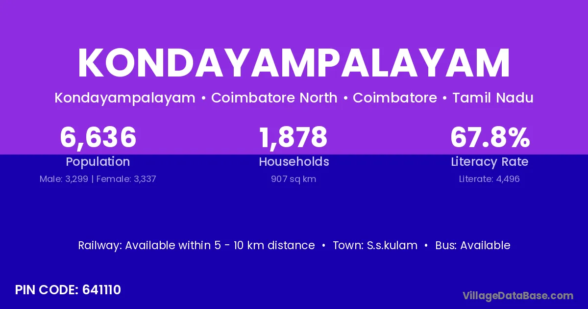 Kondayampalayam village has a total population of 6,636 people, of which 3,299 are males and 3,337 are females.