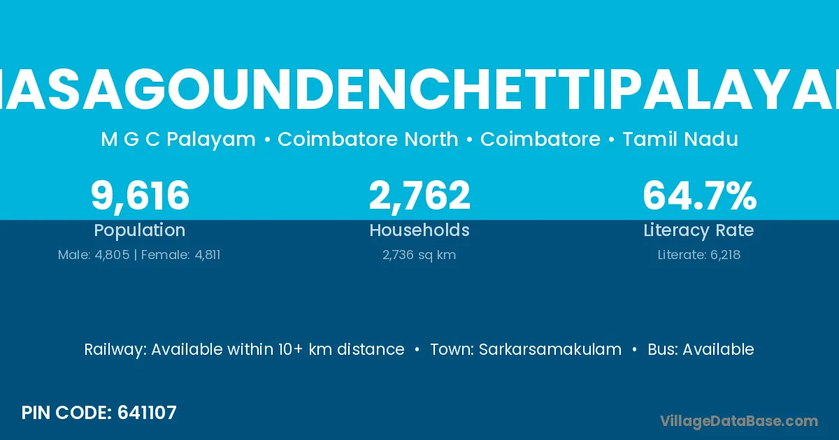 Masagoundenchettipalayam village has a total population of 9,616 people, of which 4,805 are males and 4,811 are females.