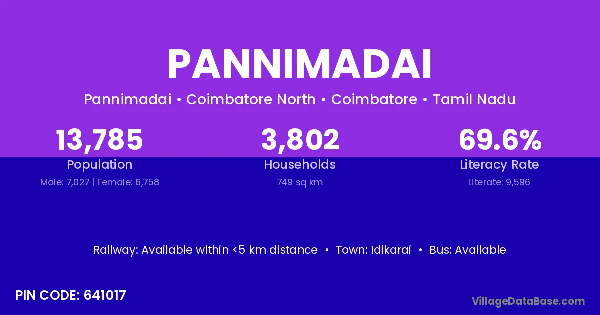 According to Census 2011 information, the village code of Pannimadai village is 641017.