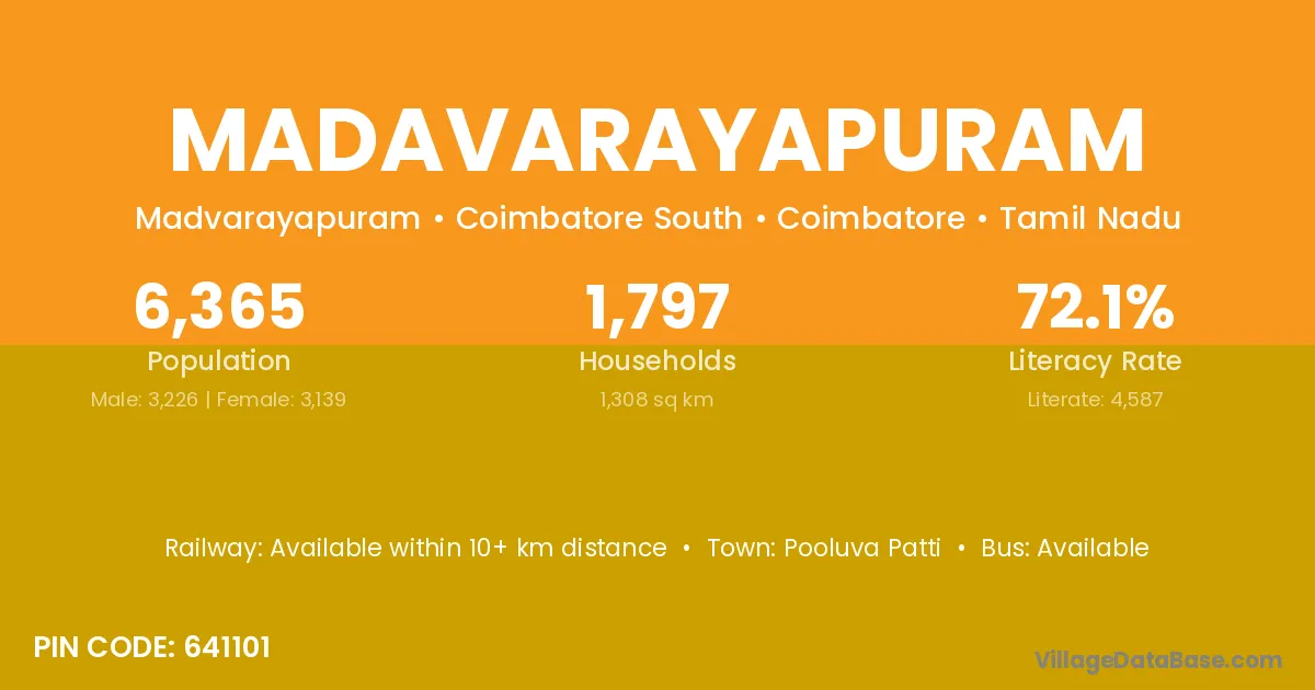 Madavarayapuram village has a total population of 6,365 people, of which 3,226 are males and 3,139 are females.