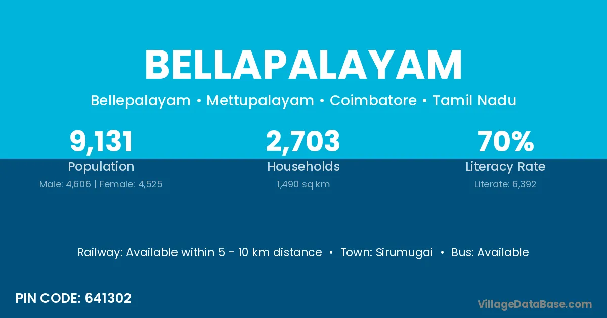 Bellapalayam village has a total population of 9,131 people, of which 4,606 are males and 4,525 are females.