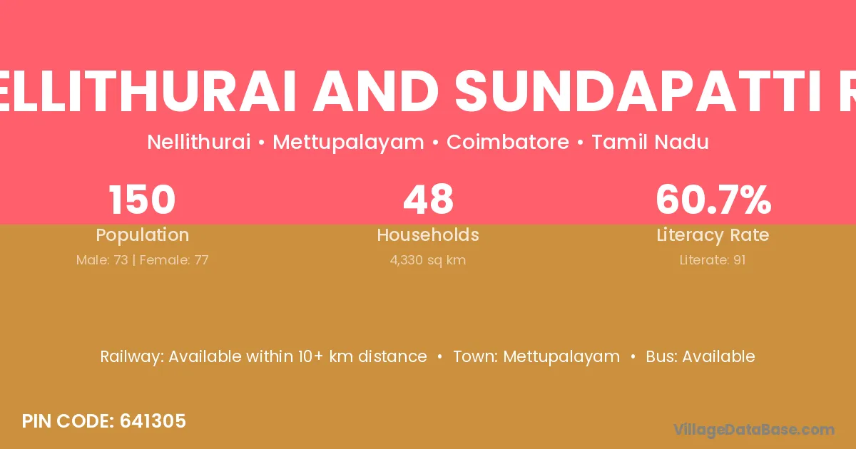 Nellithurai And Sundapatti R F village has a total population of 150 people, of which 73 are males and 77 are females.
