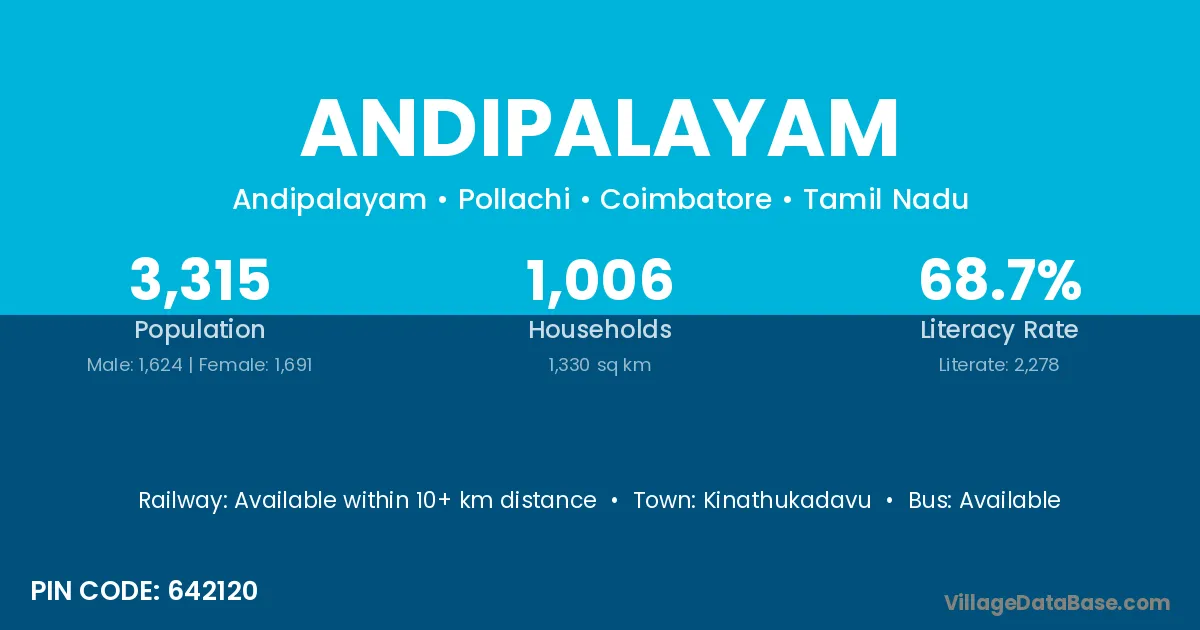 According to Census 2011 information, the village code of Andipalayam village is 642120.