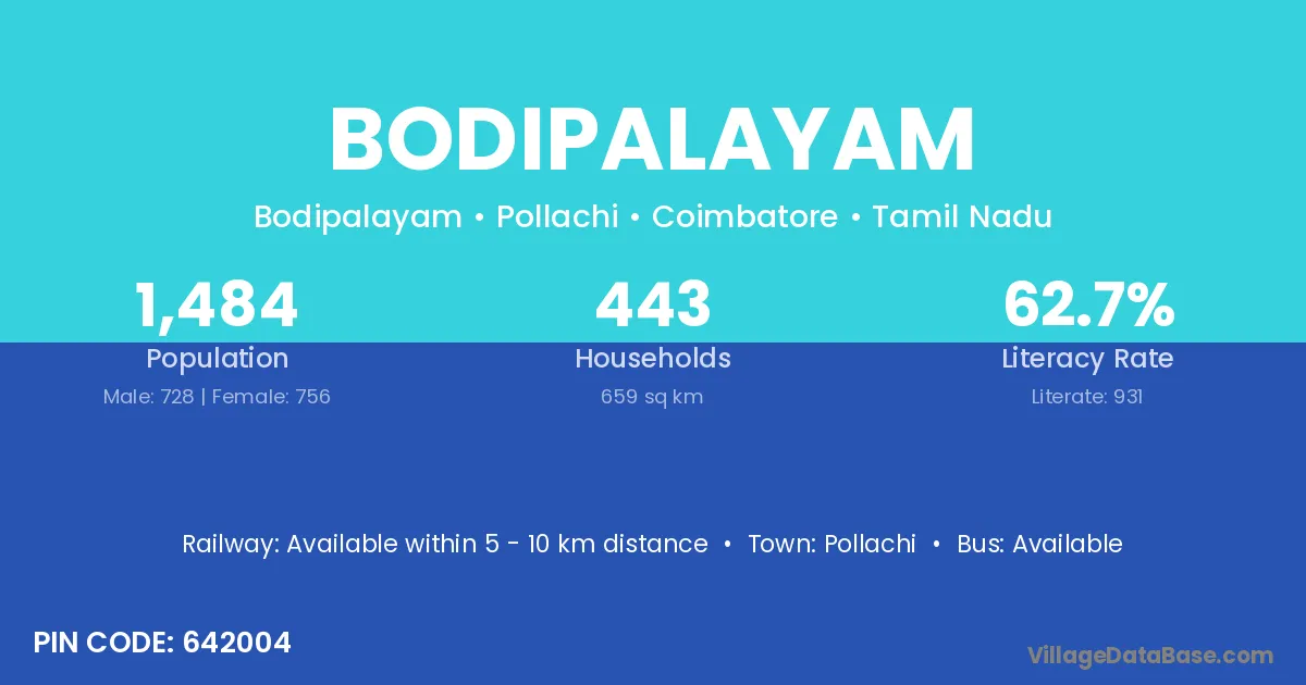 Bodipalayam village has a total population of 1,484 people, of which 728 are males and 756 are females.
