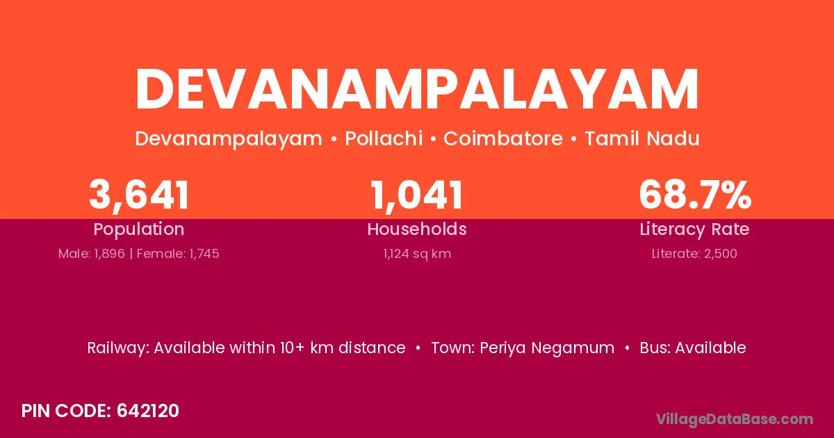 Devanampalayam village has a total population of 3,641 people, of which 1,896 are males and 1,745 are females.