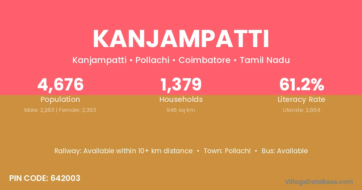 Kanjampatti village has a total population of 4,676 people, of which 2,283 are males and 2,393 are females.
