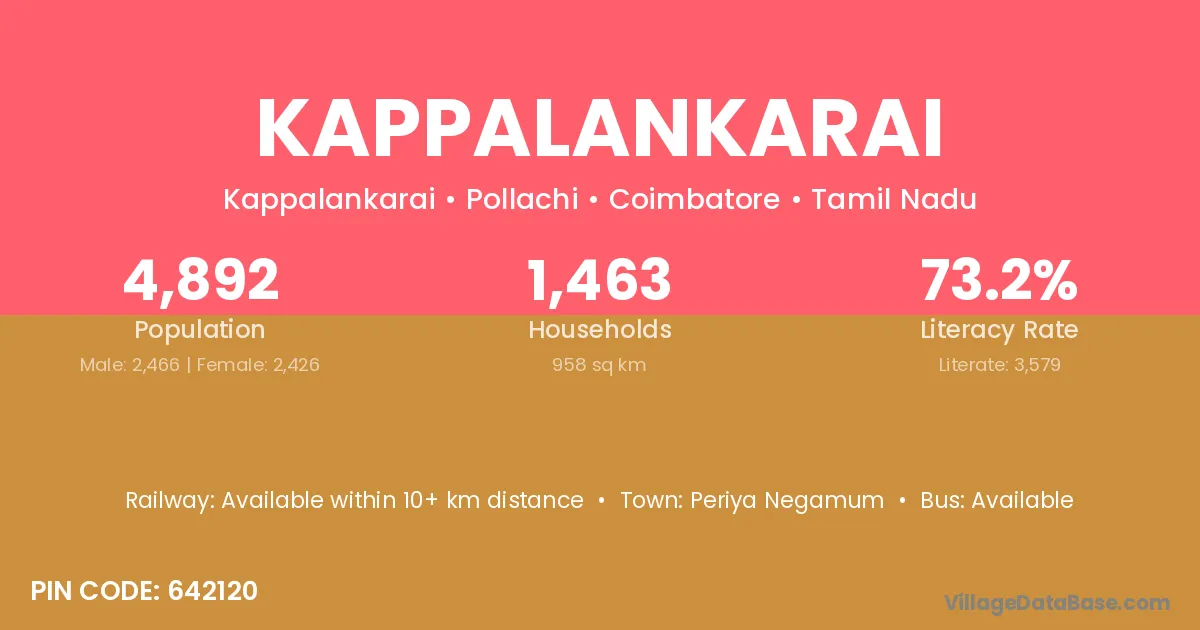 According to Census 2011 information, the village code of Kappalankarai village is 642120.