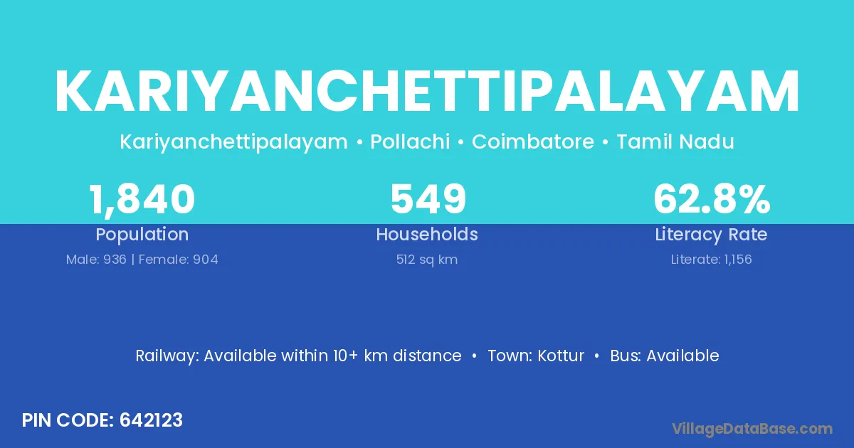 Kariyanchettipalayam village has a total population of 1,840 people, of which 936 are males and 904 are females.