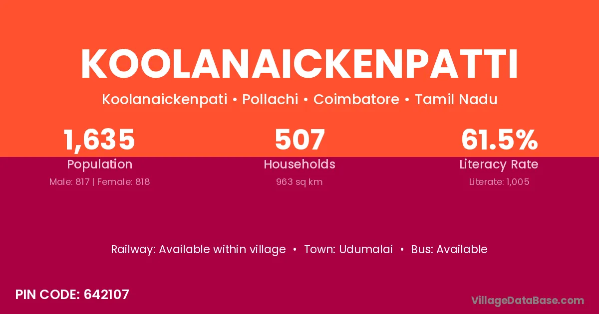 Koolanaickenpatti village has a total population of 1,635 people, of which 817 are males and 818 are females.