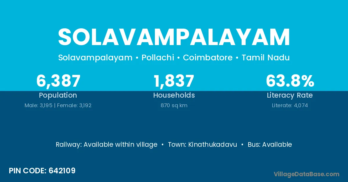 Solavampalayam village has a total population of 6,387 people, of which 3,195 are males and 3,192 are females.