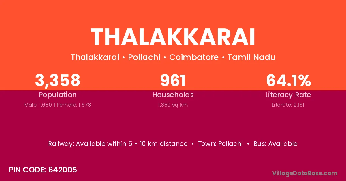 Thalakkarai village has a total population of 3,358 people, of which 1,680 are males and 1,678 are females.