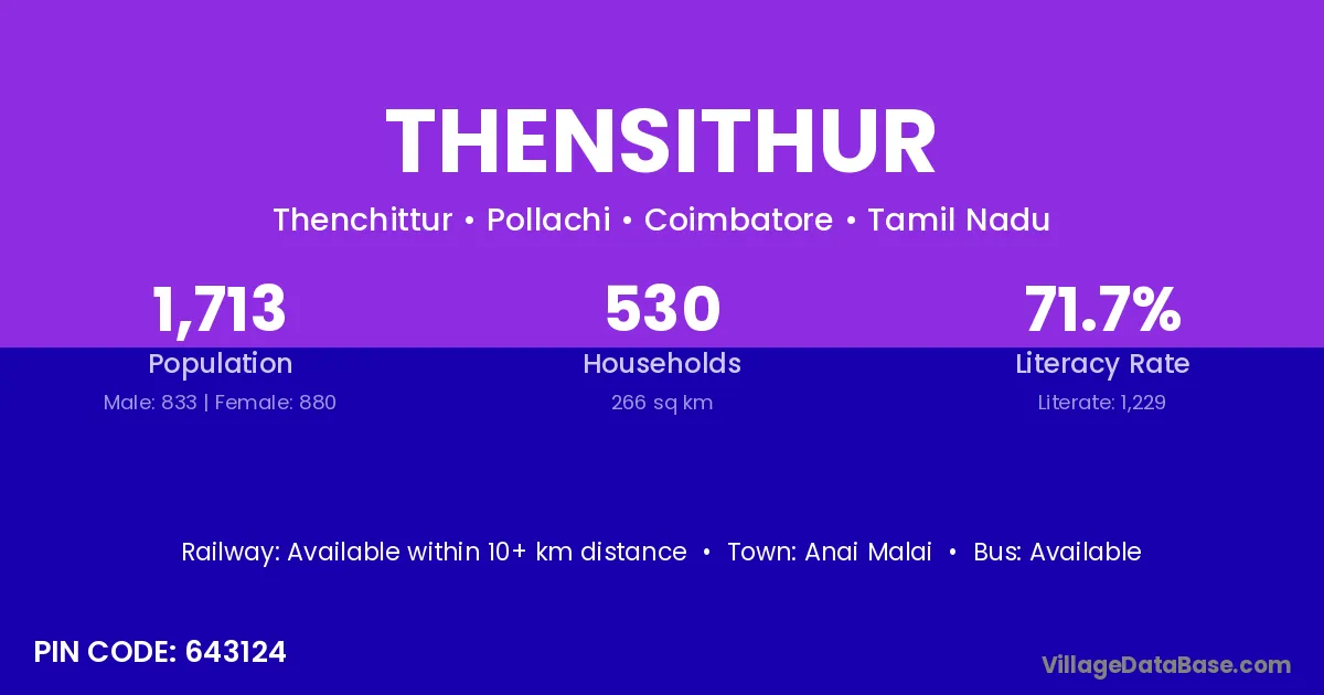Thensithur village has a total population of 1,713 people, of which 833 are males and 880 are females.