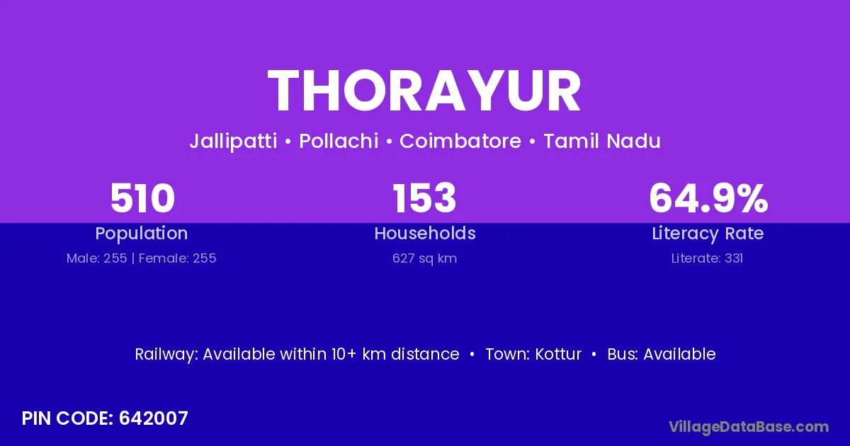 Thorayur village has a total population of 510 people, of which 255 are males and 255 are females.