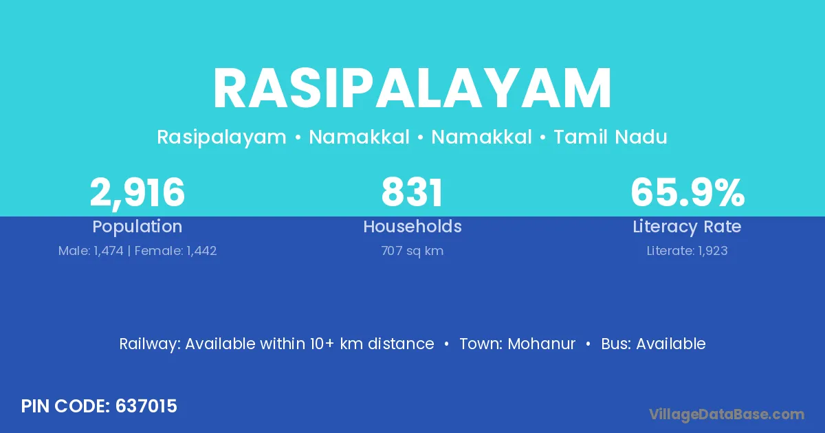 Rasipalayam village has a total population of 4,407 people, of which 2,208 are males and 2,199 are females.