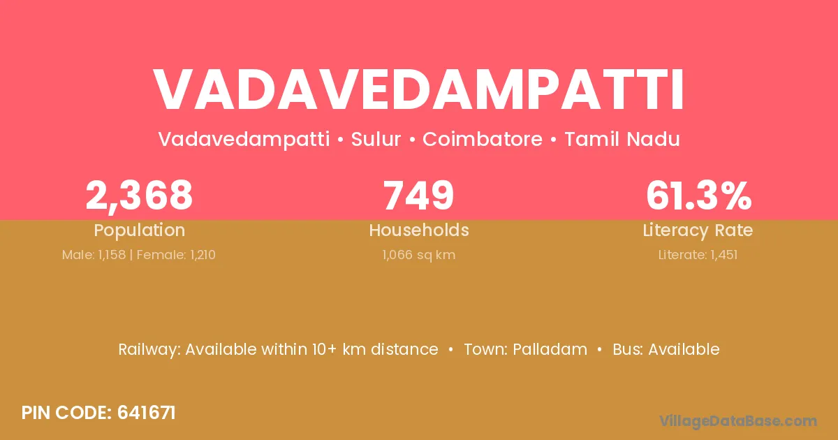 Palladam is the nearest town to Vadavedampatti village for major economic activities