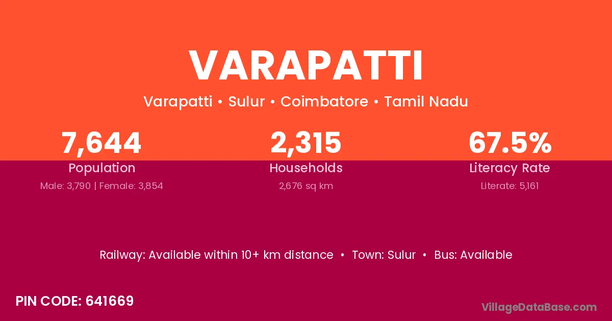 Varapatti village has a total population of 7,644 people, of which 3,790 are males and 3,854 are females.