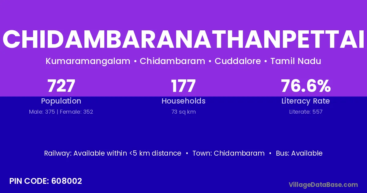 Chidambaranathanpettai village has a total population of 727 people, of which 375 are males and 352 are females.