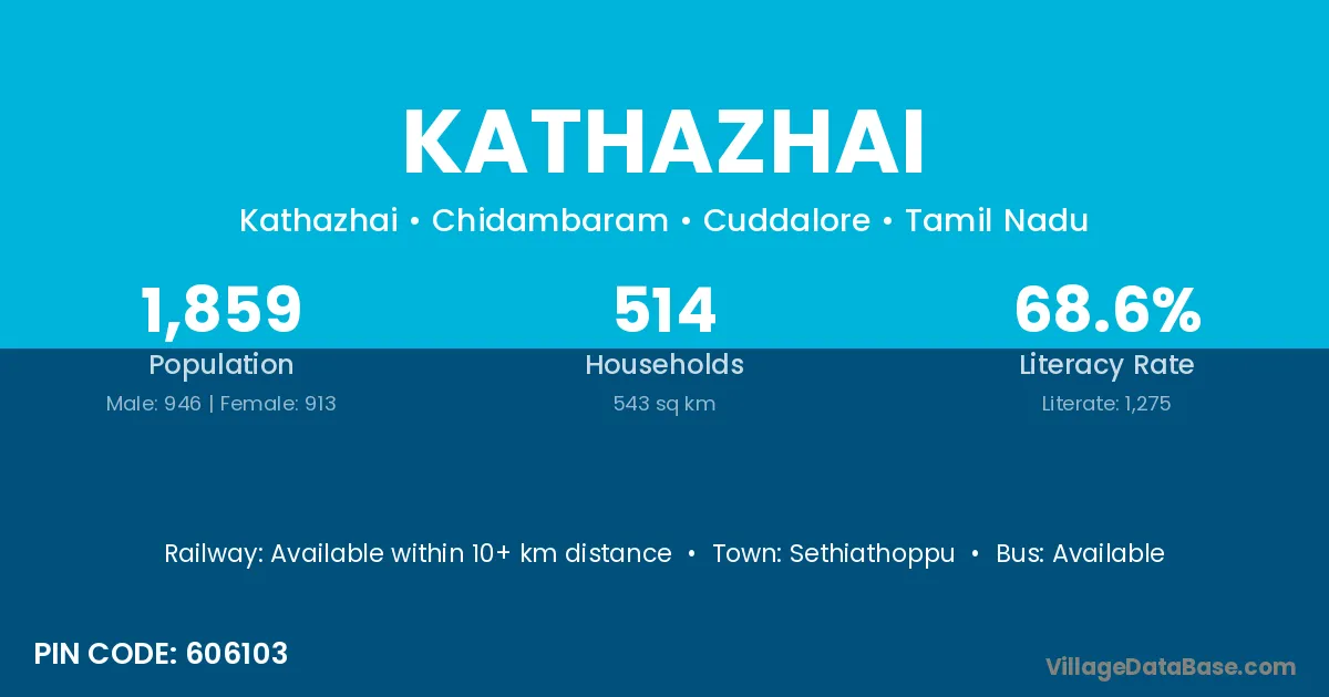 Kathazhai village has a total population of 1,859 people, of which 946 are males and 913 are females.