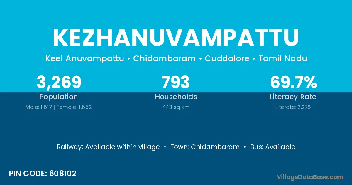 Kezhanuvampattu village has a total population of 3,269 people, of which 1,617 are males and 1,652 are females.