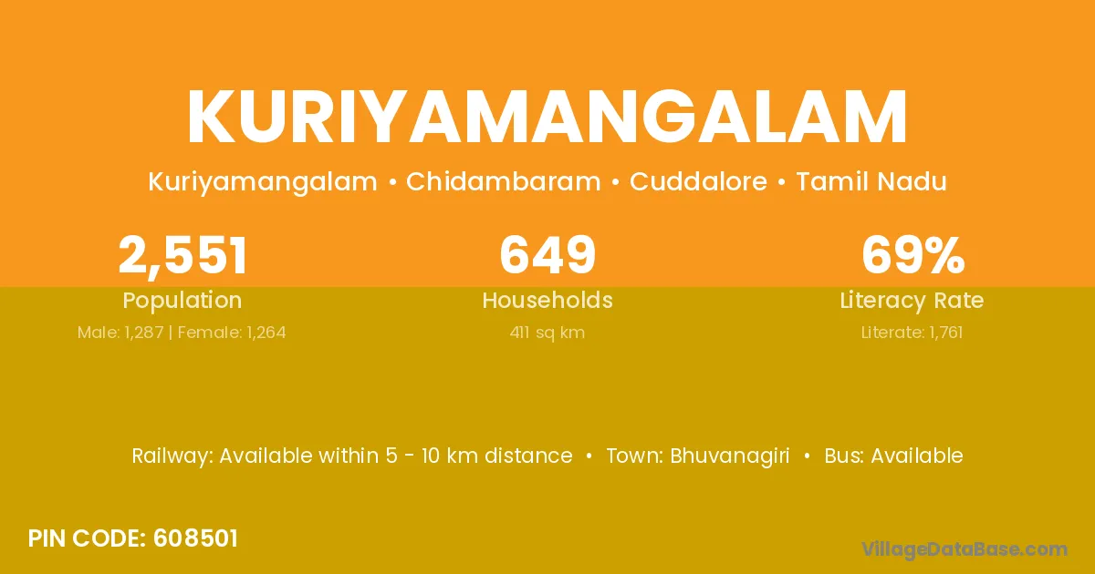 Bhuvanagiri is the nearest town to Kuriyamangalam village for major economic activities