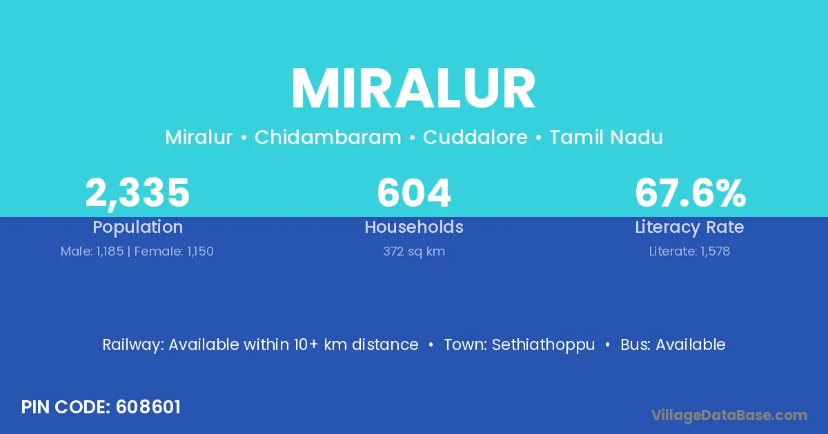 According to Census 2011 information, the village code of Miralur village is 608601.