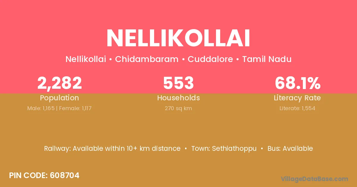 According to Census 2011 information, the village code of Nellikollai village is 608704.