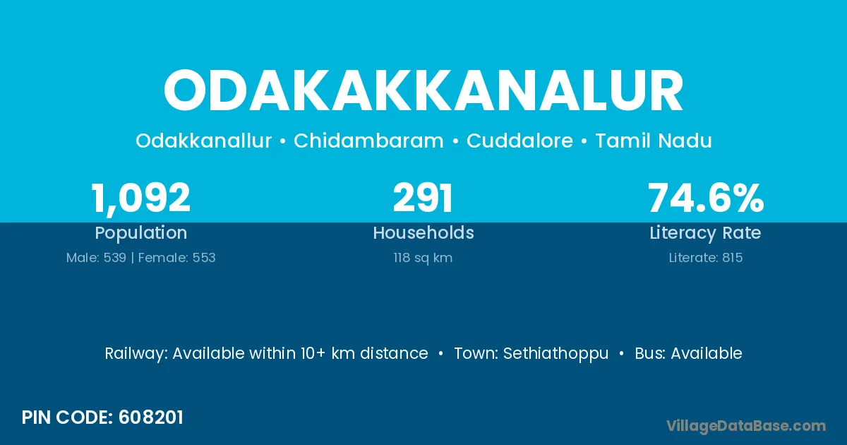 Odakakkanalur village has a total population of 1,092 people, of which 539 are males and 553 are females.