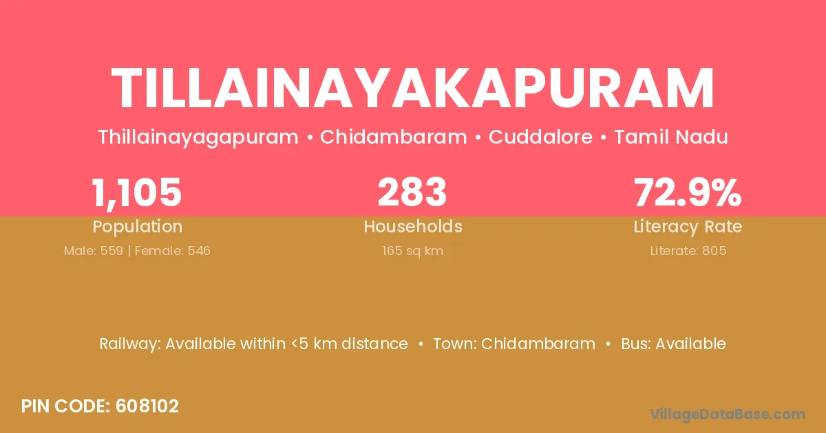 According to Census 2011 information, the village code of Tillainayakapuram village is 608102.