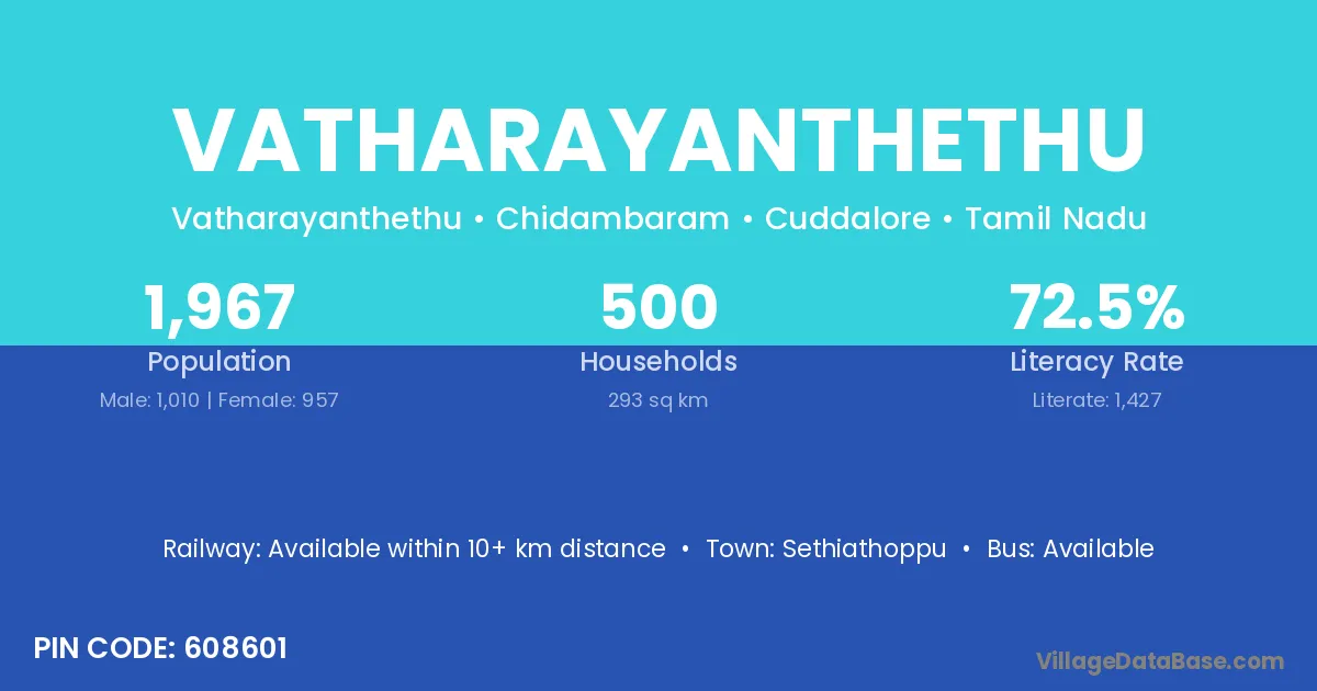 Vatharayanthethu village has a total population of 1,967 people, of which 1,010 are males and 957 are females.