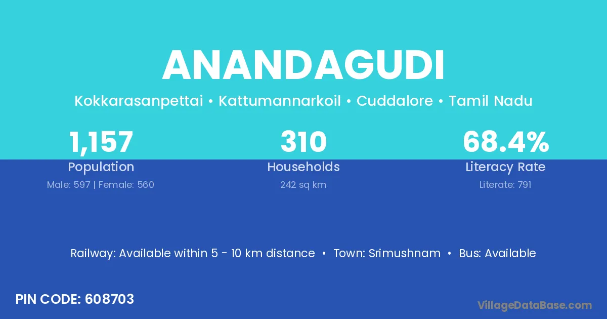 Anandagudi village has a total population of 1,157 people, of which 597 are males and 560 are females.