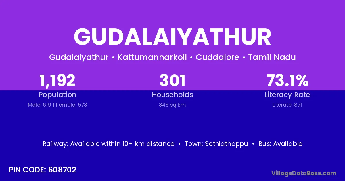 According to Census 2011 information, the village code of Gudalaiyathur village is 608702.