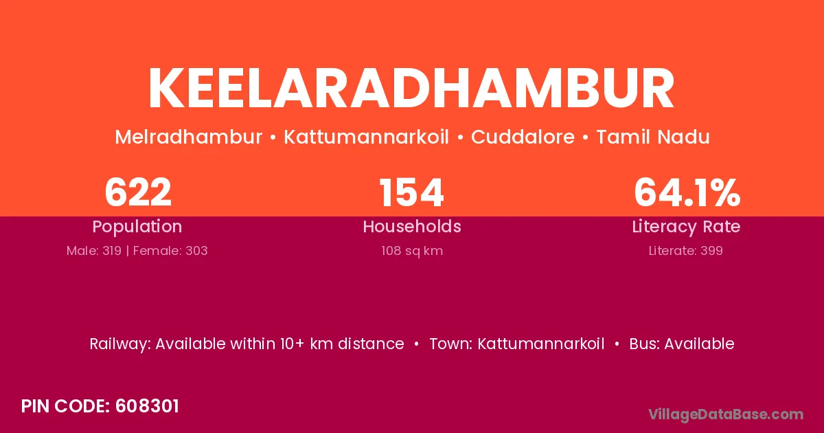 According to Census 2011 information, the village code of Keelaradhambur village is 608301.