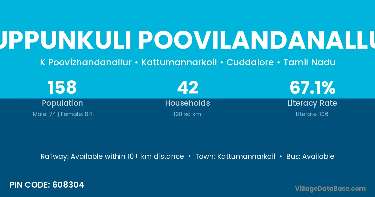 Kuppunkuli Poovilandanallur village has a total population of 158 people, of which 74 are males and 84 are females.