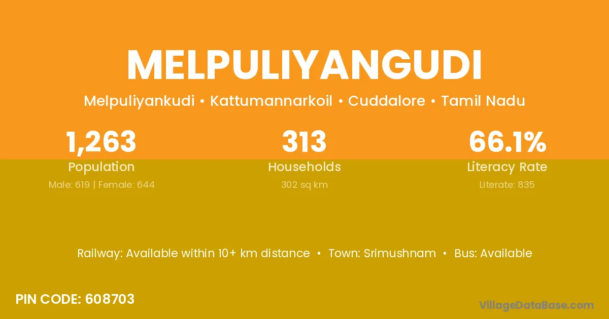 Melpuliyangudi village has a total population of 1,263 people, of which 619 are males and 644 are females.