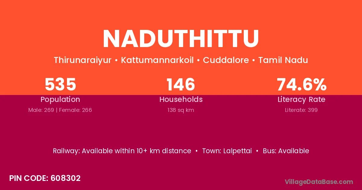 Naduthittu village has a total population of 535 people, of which 269 are males and 266 are females.