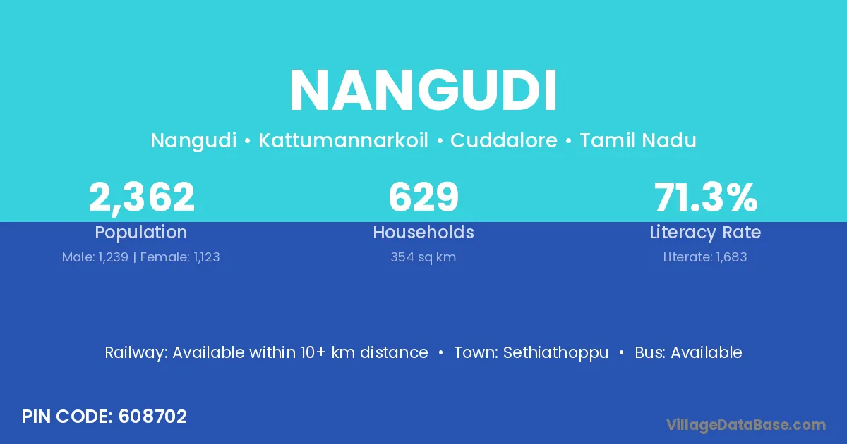 Nangudi village has a total population of 2,362 people, of which 1,239 are males and 1,123 are females.