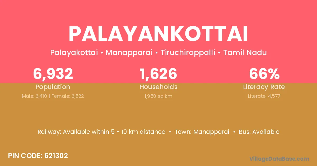 The literacy rate of Palayankottai village is 72.58%. Male literacy stands at 80.86% and female literacy at 63.63%.