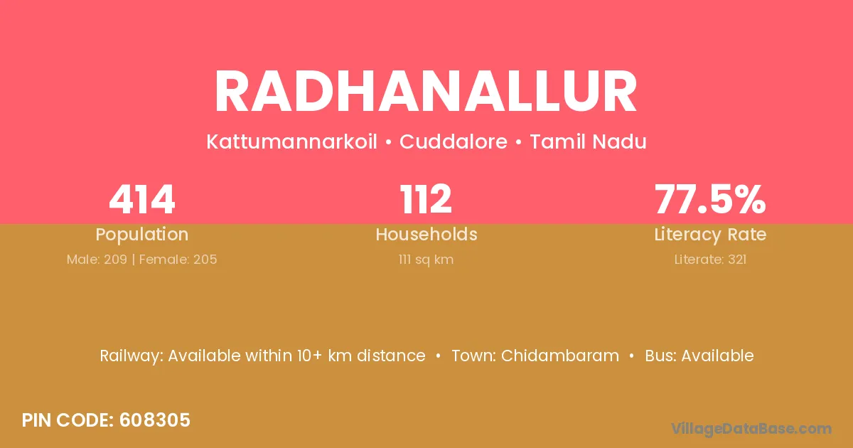 According to Census 2011 information, the village code of Radhanallur village is 608305.