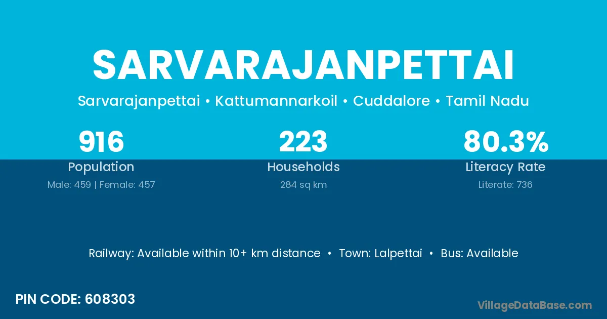 Sarvarajanpettai village has a total population of 916 people, of which 459 are males and 457 are females.