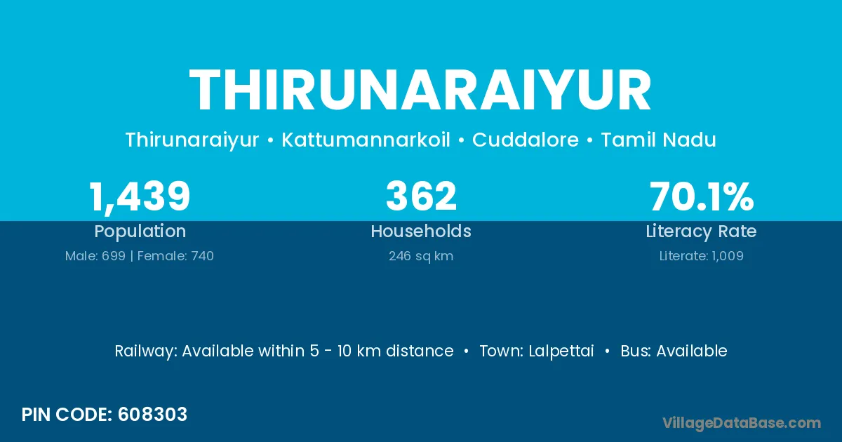 Thirunaraiyur village has a total population of 1,439 people, of which 699 are males and 740 are females.