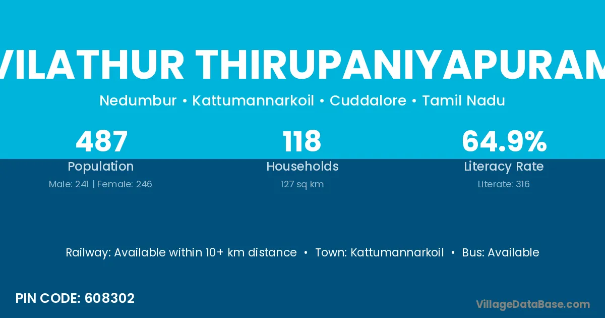 Vilathur Thirupaniyapuram village has a total population of 487 people, of which 241 are males and 246 are females.