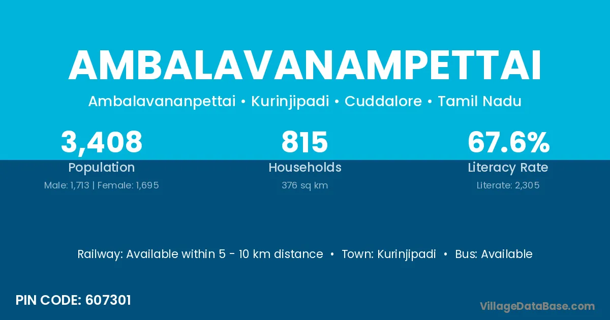 Ambalavanampettai village has a total population of 3,408 people, of which 1,713 are males and 1,695 are females.