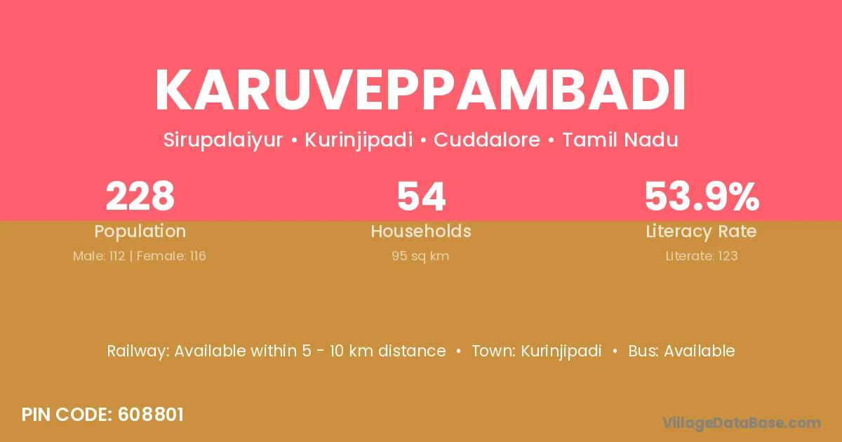 Karuveppambadi village has a total population of 228 people, of which 112 are males and 116 are females.