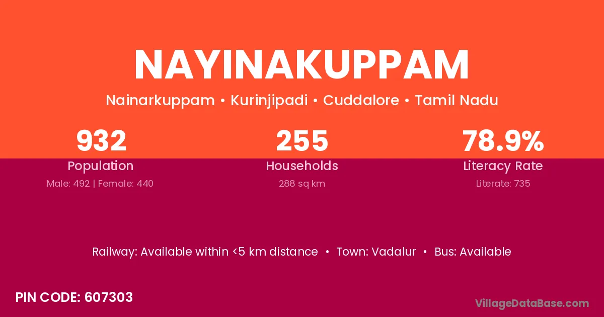 Nayinakuppam village has a total population of 932 people, of which 492 are males and 440 are females.