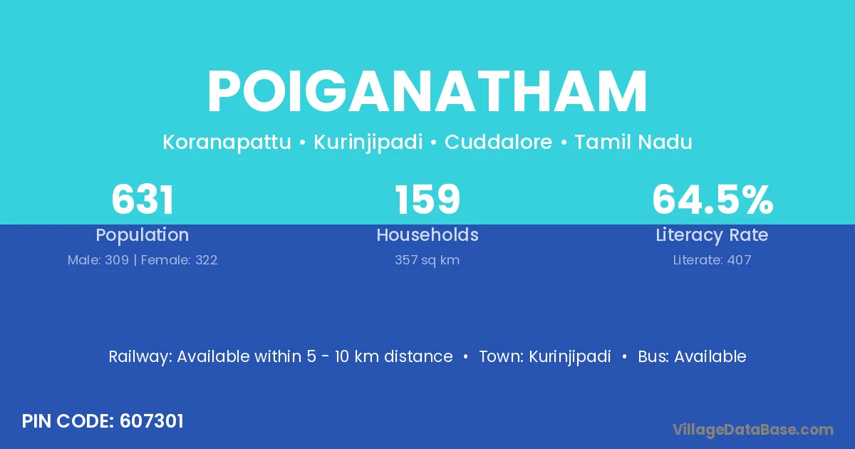 Poiganatham village has a total population of 631 people, of which 309 are males and 322 are females.