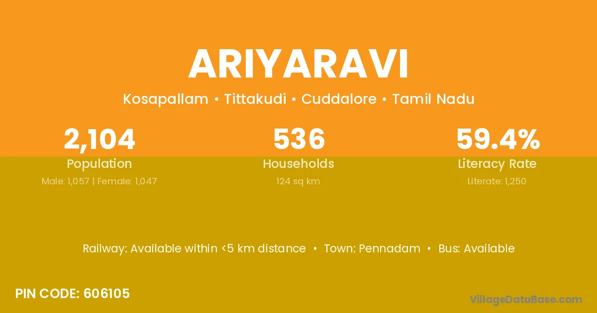 Ariyaravi village has a total population of 2,104 people, of which 1,057 are males and 1,047 are females.
