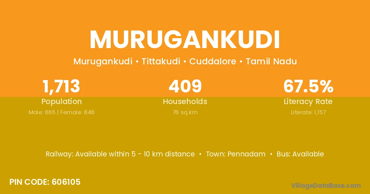 Murugankudi village has a total population of 1,713 people, of which 865 are males and 848 are females.