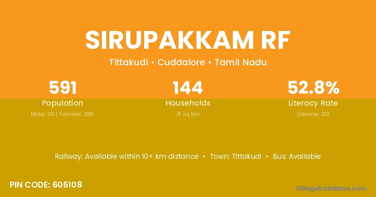 Sirupakkam Rf village has a total population of 591 people, of which 311 are males and 280 are females.