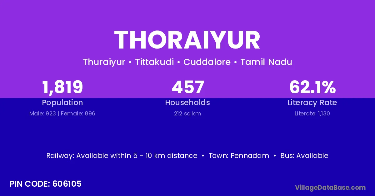 According to Census 2011 information, the village code of Thoraiyur village is 606105.