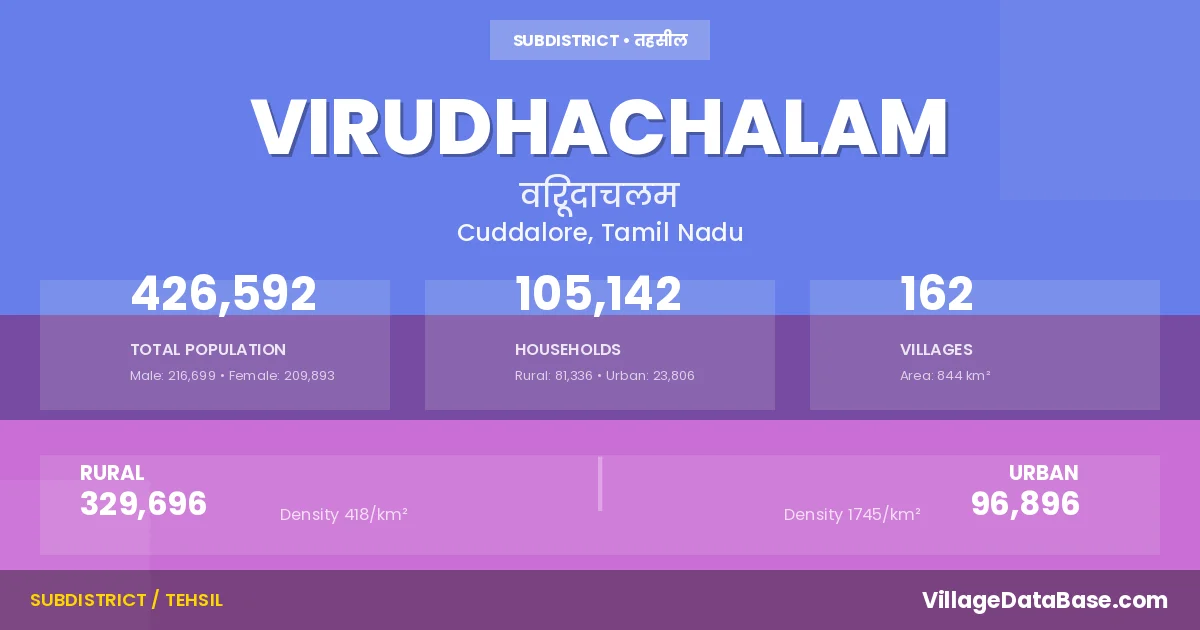 According to the 2011 census The total area of Virudhachalam Taluka is 844 km², with a population of 426592 people. The population density is 505 inhabitants per square kilometre, and there are approximately 105142 houses in the sub district.